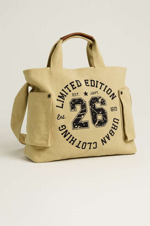 BOLSO RÚSTICO CON MANIJAS Y CORREA REGULABLE. BOLSILLOS DELANTEROS.